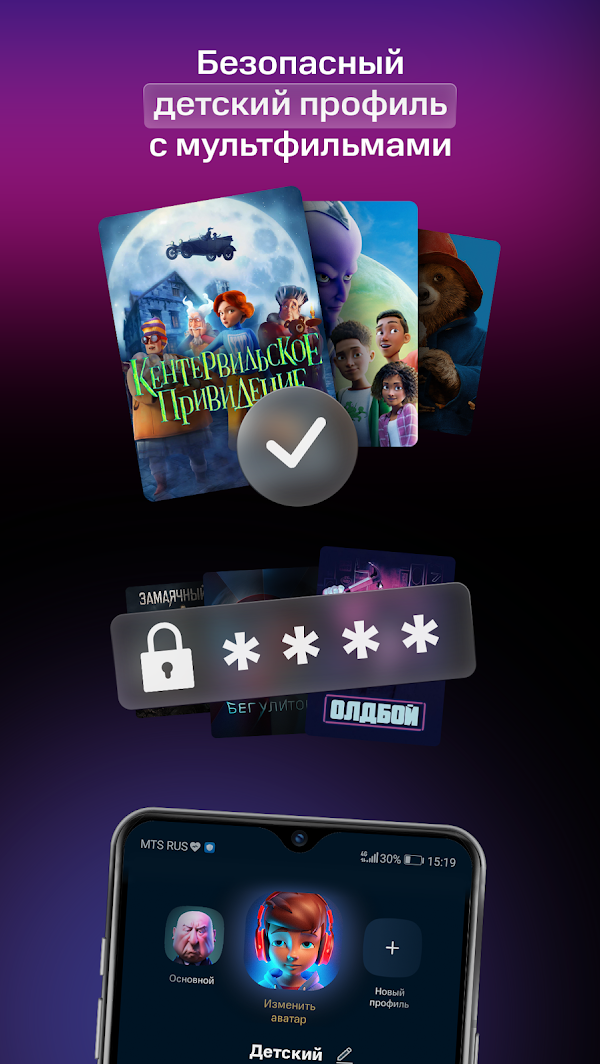 Use a separate profile for children - nothing extra, just your favorite cartoons. Cartoons for children are available in our library (just type in the search “cartoons online in the application”, “cartoons offline”, “cartoons without the Internet” and “cartoons on TV”. And children’s TV channels can be selected in advance, the TV program is available at any time online and on the website.