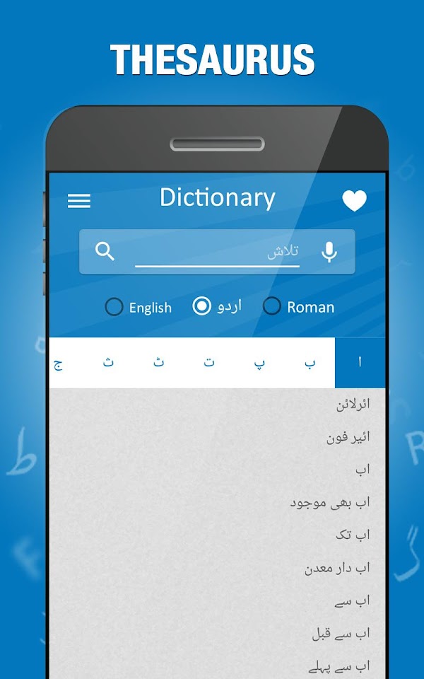 - Thesaurus – sorted list of all words starting with alphabets in English, Roman and Urdu.