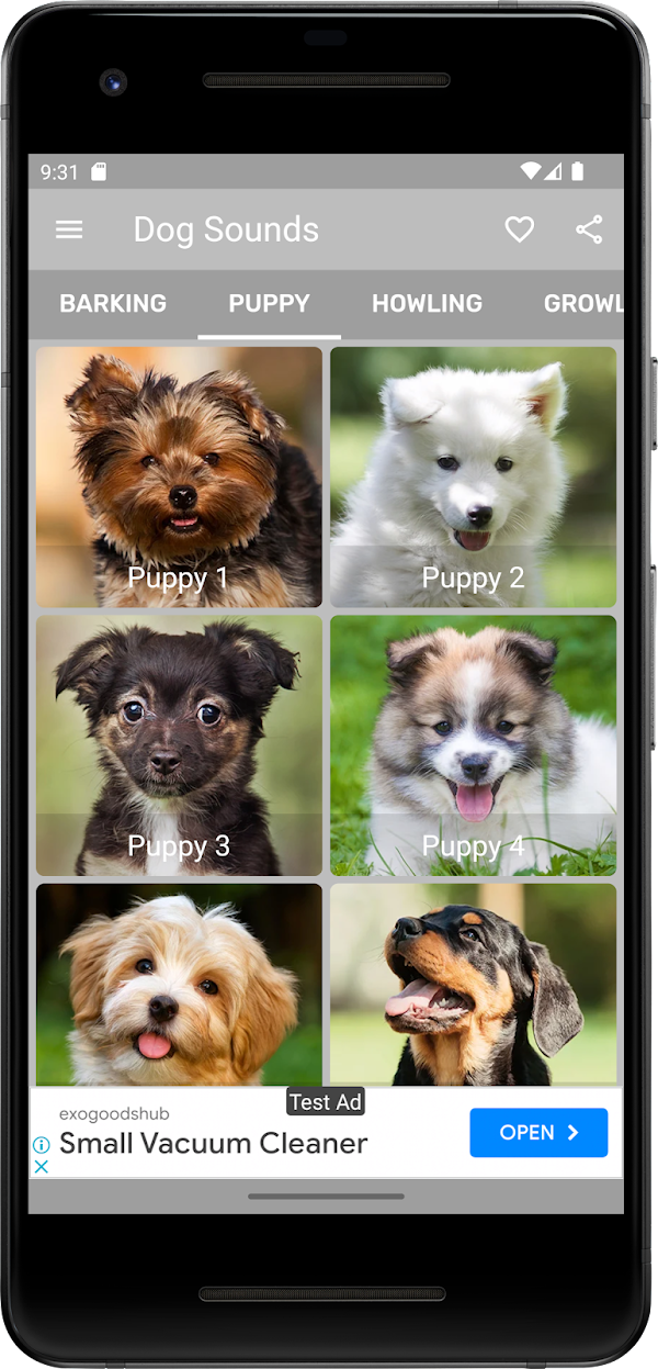 Delight with the largest collection of different types of dog sounds, barking, puppy, howling, whimper, growl and toy sounds.