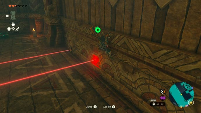 Use Ultrahand on the lever on the right-hand side of this area across the gap if you want an easy way out - or in - of this place. Next, you need to use Ascend under the crumbling ledges above Link when you're across the gap to get to the next Wind Lock, but don't forget to pick up the Ruby beside the nearby enemy first!