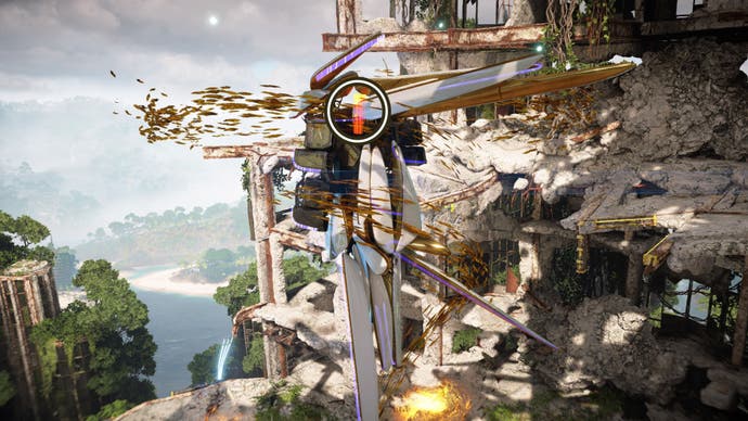 The next thing you need to do is break the Power Core on the back of the machine, but you cannot reach this from where you are with Seyka. Instead, you need to find a way to climb higher to get a clear shot of the Core.
