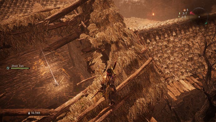 After meeting Zhao Yun and heading up to the village on the hill, the first Marking Flag is on top of the wooden gate entrance but you'll have to head further up the hill and hop along the rooftops to reach it.