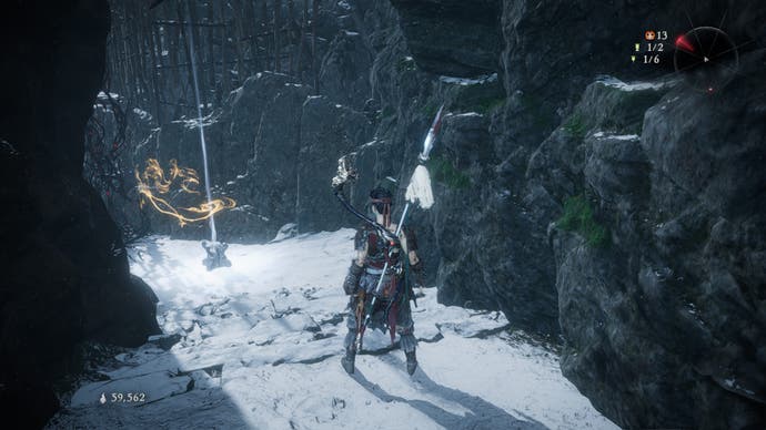 Once you’re inside the fortress walls, head left past the tiger demon to a cabin split in two by a chasm. Jump into the chasm and land on the ledge of demonic roots below. Follow the roots across the canyon and onto a ledge with the next flag.