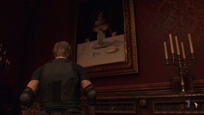 Instead of finding a file or item locations like other puzzles, to solve the Dining Hall bell puzzle, you have to look at the portraits of the man and woman at the back of the room. Leon needs to sit on the chair with the same table contents of the man, and Ashley needs to sit in the chair with the same table contents as the woman.
