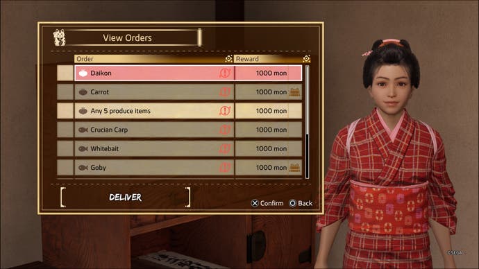 Approach this cabinet, and you’ll be given the option to fulfil orders, sending out Haruka to deliver goods you’ve accumulated at the farm for paying clients. This is how you’re going to pay off the massive debt Haruka’s found herself in, and in actual fact, it’s one of the best ways of earning money in Ishin.