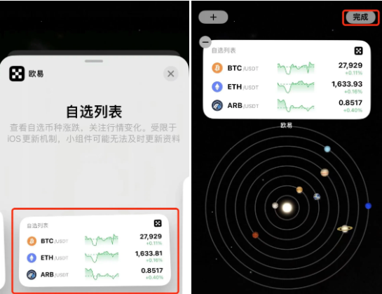 2、左右滑动选择“主流币”或者“自选列表”等内容,点击【添加小组件】—【完成】,即可完成主屏幕添加欧易小组件。
