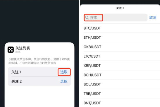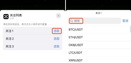 3、点击已经添加的欧易小组件,点击【选取】—搜索或者下拉找到您想添加到关注列表的币种完成操作。