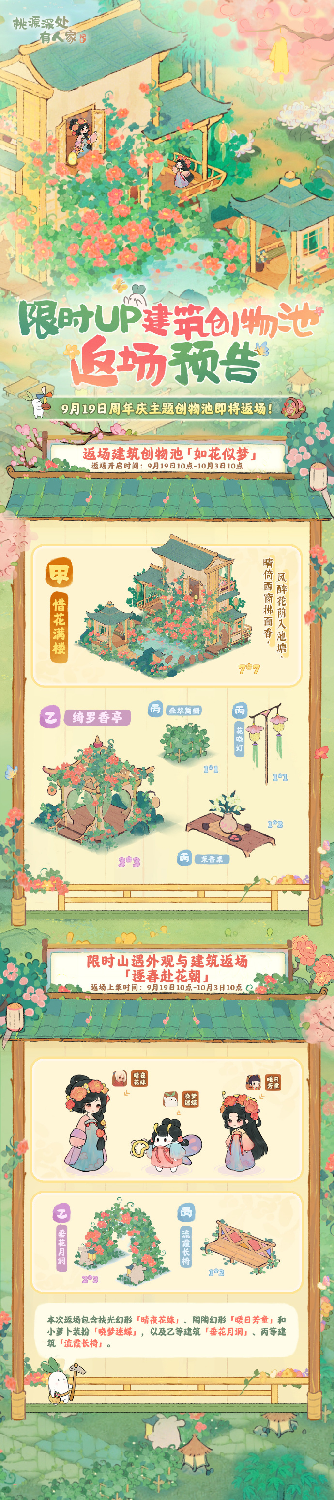 At 10:00 on September 19, the anniversary theme "Like a Flower, Like a Dream" building creation pool and the "Following the Spring to the Flower Festival" mountain encounter appearance and building return will be opened. Interested mountain people must not miss it!